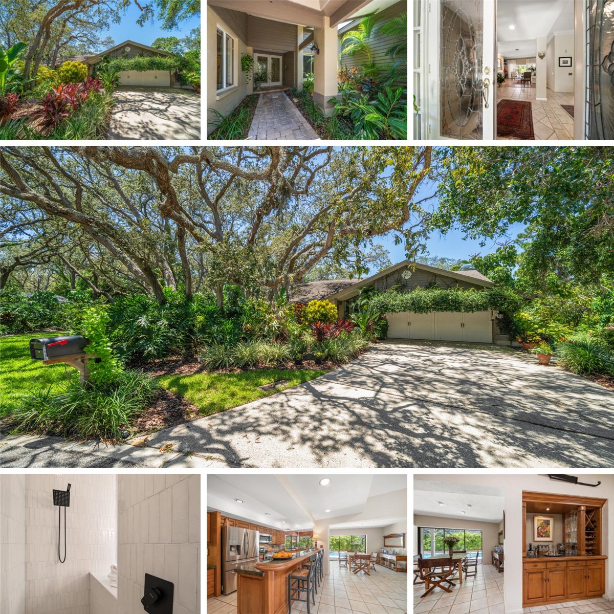 In the heart of desirable Dunedin on a quiet cul-de-sac in the coveted Weybridge Woods neighborhood, this lovely home offers elegance, comfort, and exceptional outdoor living. Tropical landscaping and majestic oaks provide privacy and a unique curb appeal. Follow the paver entry to the beautiful double leaded-glass front doors. Inside, the formal living room features an impressively high ceiling, fireplace and sliders opening to the lanai, enclosed pool and spa. A spacious floor plan lends to flow and a formal dining room impresses with a garden view. Skylights, custom built-ins and a second fireplace make the large family room perfect for entertaining or lounging. The dine-in kitchen features granite countertops, stainless steel appliances and windows and sliders that open to the pool. Beyond it, winding shell pathways meander through lush, tropical foliage. The split bedroom plan provides exceptional privacy. Just off the great room/kitchen, a hall, two bedrooms and bath with pool access make it perfect for family or guests. On the opposite end of pool, the large primary suite opens to the lanai. A newly renovated, spa-like ensuite with a garden tub, custom tiled walk-in shower, double vanity and private commode make it a dream space. A fourth bedroom has a TV small private hall and bathroom. The floor plan and property layout make this home a rare find. Blocks from Dunedin Country Club, downtown, restaurants, shops, parks and marina, this golf cart friendly community is minutes away from the pristine beaches of Honeymoon and Caladesi Island.